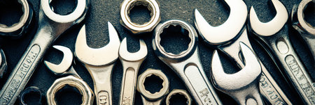 Steel wrenches on black background. Tools banner on black background