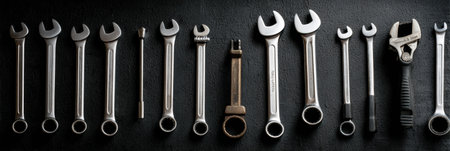 A diverse assortment of metal wrenches and sockets is laid out on a dark surface, highlighting their various sizes and types used for repairs and maintenance.