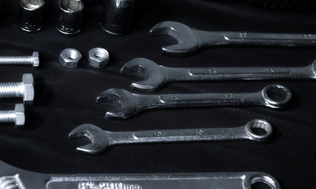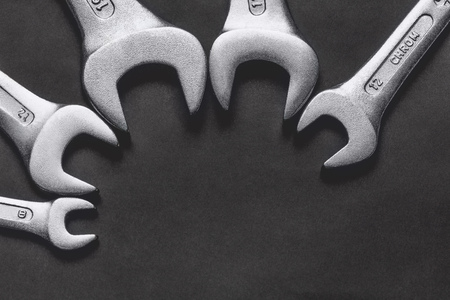 Set of spanners and wrenches on dark background