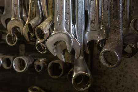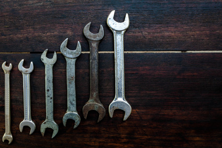 Dirty set of Wrench on a tool box/vintage background with a tools