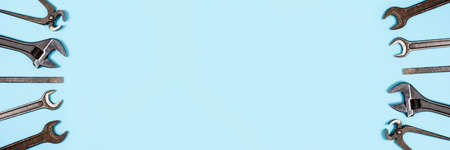Happy fathers day or labor day long banner with copy space. Man or husband concept. Different wrenches on blue background