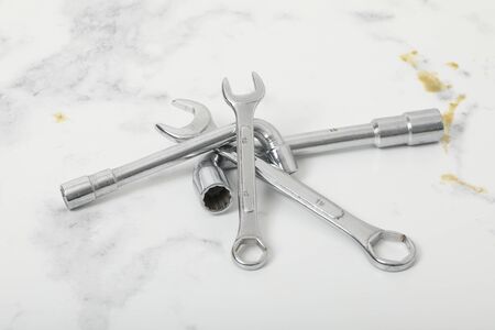 several wrenches on the background of metal painted plates