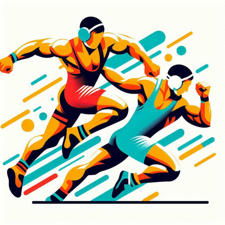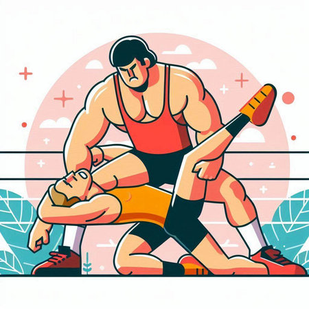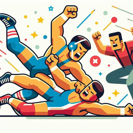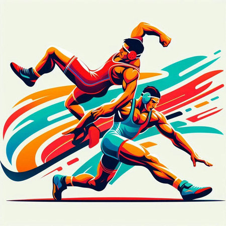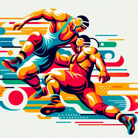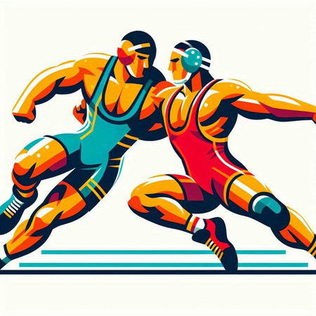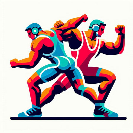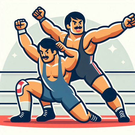 Illustration of a wrestlers wrestling with USA flag in the background done in retro style.