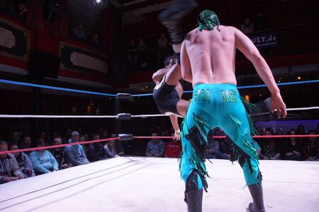 Two masked Lucha libre wrestlers in the ring. Mexican Luchadores during the fight.