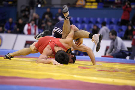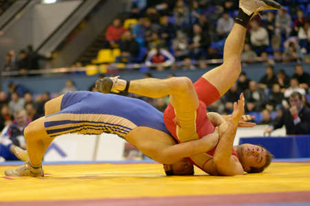 Kiev, Ukraine - February 16, 2013 Match between Razmik Oganesyan, Russia, red and Zhanbolat Magzumov, Kazakhstan during XIX International freestyle wrestling and female wrestling tournament in Kiev, Ukraine on February 16, 2013
