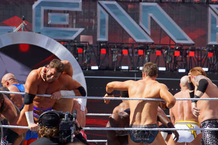 Santa Clara, California - March 29, 2015: Andre the Giant battle royal 2015 with WWE Wrestler Zack Ryder is being throw over the ropes with Miz, Heath Slater and other wrestlers fighting in ring during at Wrestlemania 31 at the Levi's Stadium.