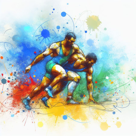 Intense wrestling match between two muscular athletes on a sandy mat showcasing strength and technique in a competitive atmosphere