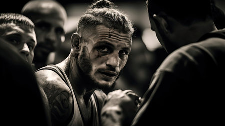 Wrestler in focus, poised and ready for the match in a spotlight, against a dark backdrop