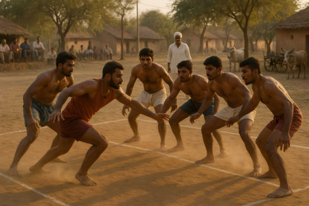 Indian kabaddi athletes playing a match in a rural village, showcasing the sport's popularity and tradition