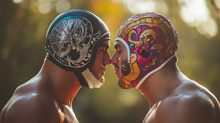 Two masked wrestlers face-off, wearing colorful, intricate headgear, outdoors