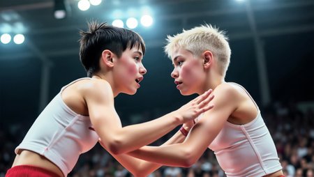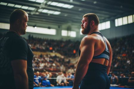 Close-up of two wrestlers in a tense moment, concentrating before the match begins