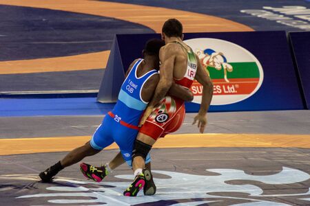 Greco-Roman wrestling. Two sportsmens wrestlers in red and blue uniform wrestling against wrestling carpet