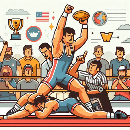 Intense wrestling competition between two athletes in a gym setting showcasing strength and strategy during their match