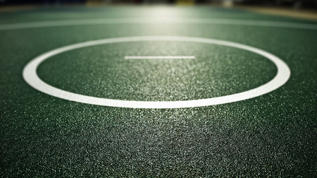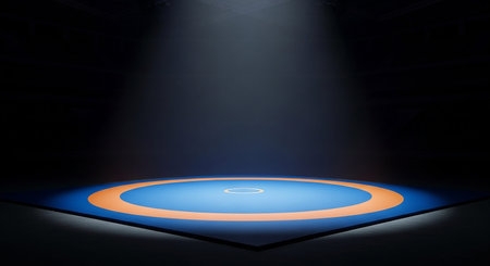 A wrestling mat in a dark arena is illuminated by a spotlight with circular markings.