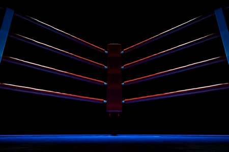 boxing ring showcases three parallel ropes vividly lit in red and blue creating an electrifying atmosphere for an exciting match or event.