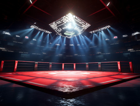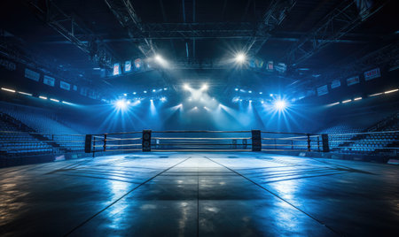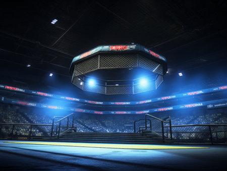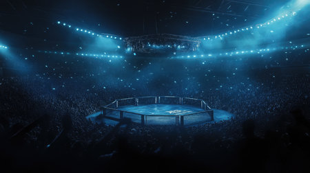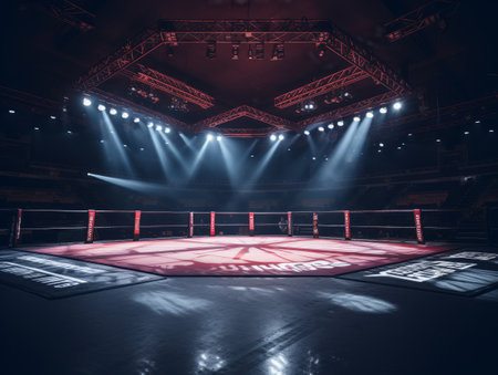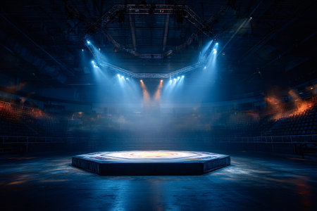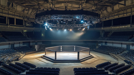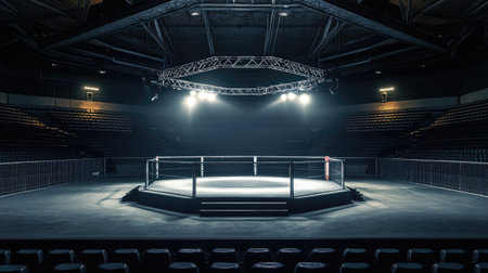 Empty mma octagon ring in an expansive dark stadium, brilliant spotlights creating an intense atmosphere on the competition stage, highlighting the anticipation of a future combat event