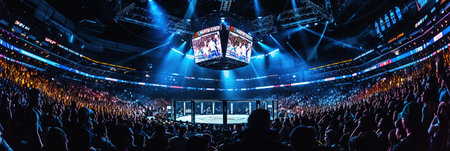 In the fighting cage. Interior view of sport arena with fans and shining spotlights