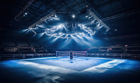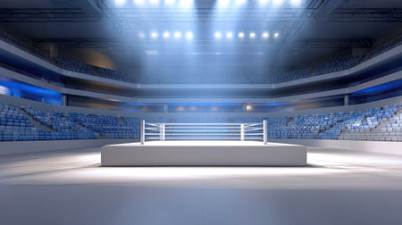 A striking view of a professional boxing ring set in an empty arena, highlighted by dramatic spotlights against blue tones, evoking anticipation for sports events.
