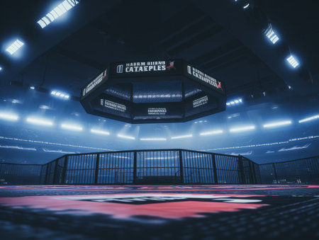 Large, empty mixed martial arts arena with a central ring, empty seats encircling the battleground, evoking anticipation for the next event.