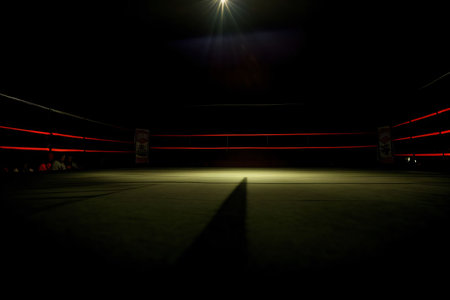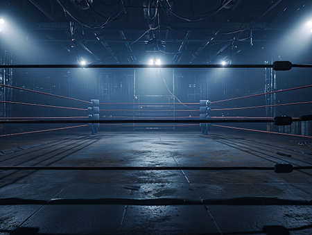An unoccupied boxing ring is captured in a dimly lit space, evoking a sense of anticipation for an upcoming fight.