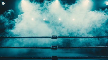 boxing ring is set under soft moody lighting with thick smoke swirling around enhancing the dramatic atmosphere before the match begins.