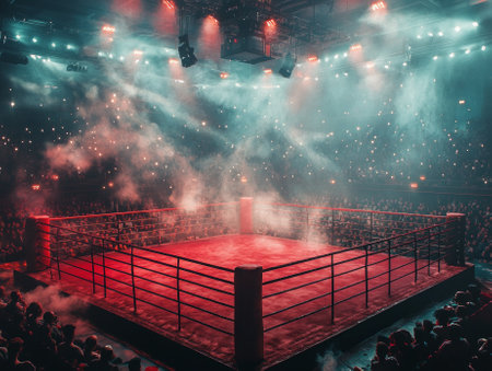 Vibrant boxing ring viewed from the audience, with bright red ropes and a misty atmosphere filled with excitement and anticipation.