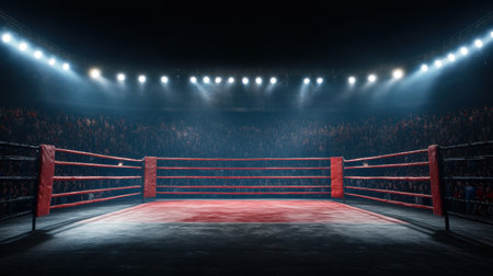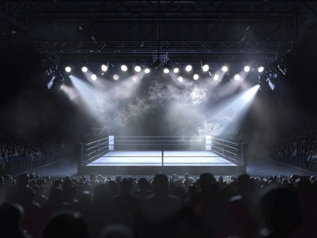 Boxing ring bathed in bright spotlights, surrounded by cheering crowd in a darkened arena.