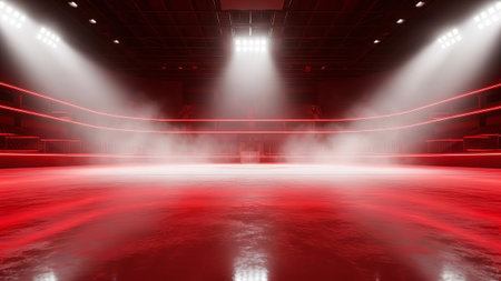 Red neon hockey rink with empty seats and fog