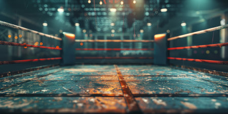 An atmospheric shot of an empty boxing ring in an abandoned arena, showcasing the interplay of light and shadow, evoking feelings of nostalgia and history.