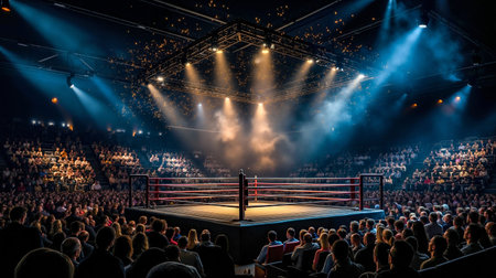 Empty boxing ring in spotlights, with smoke with blurred crowd cheering against dark background.