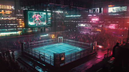 A vibrant scene inside a large dark arena filled with spectators where a boxing match is taking place under bright lights and smoke effects