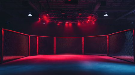 Dramatic view of an empty mma fighting cage with atmospheric red lighting awaiting a combat sport event