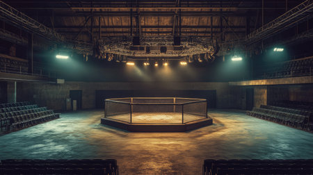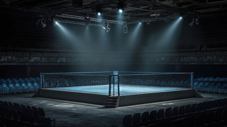 Quiet, empty mixed martial arts arena with a spotlight on the ring, waiting for the action to begin, surrounded by vacant seats.