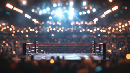 AI-generated boxing arena with blurred spectators and stadium lights, focusing on the ring and action.