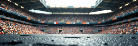 Packed stadium crowd celebrating with confetti and lights.