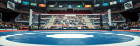 Boxing ring setup in an indoor arena with bright lighting and empty seats ready for an event