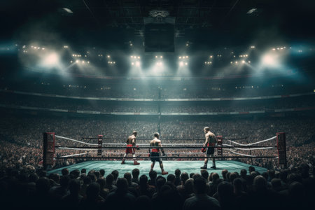 A group of men stands proudly on top of a boxing ring, Boxing match taking place in a packed stadium, AI Generated