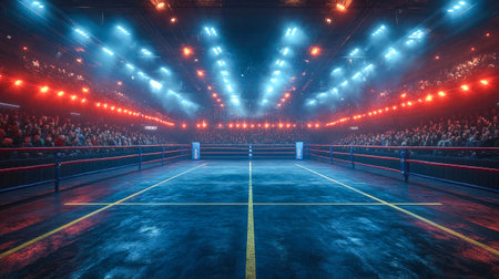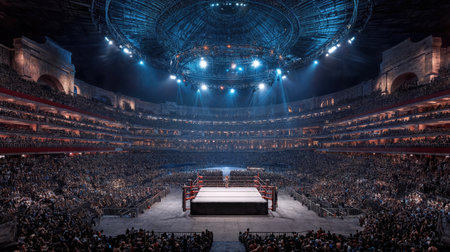 A boxing ring illuminated by blue lighting stands out in the dark arena, creating an intense ambiance for the upcoming match.