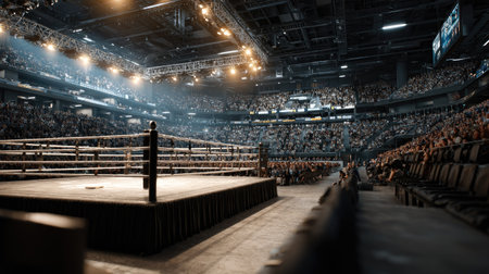 boxing ring stands ready for action surrounded by a darkened audience and illuminated overhead lights enhancing the intensity of the Fight Night setting.