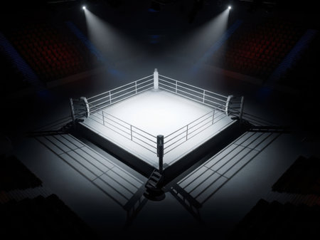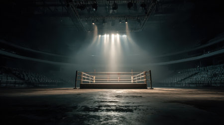 Epic empty boxing ring in the spotlight on the fight night AI