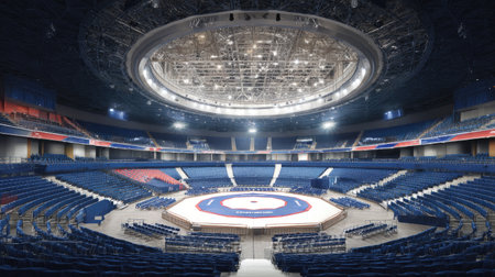 This spacious indoor arena features a central circular stage surrounded by rows of seating, ideal for sporting events and concerts in a modern urban environment.