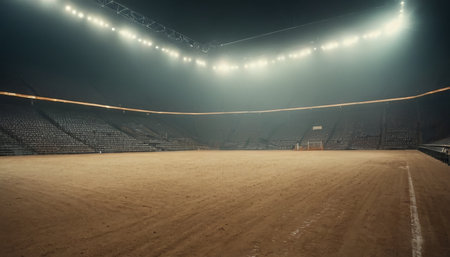 A captivating view from the volleyball court showcases the net and the empty seats, illuminated by vibrant stadium lights, creating an energetic atmosphere.