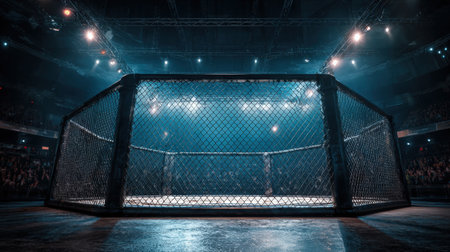 An empty MMA cage is set up under bright spotlights in an arena, creating a dramatic atmosphere for sports events. Perfect for promoting athletic competitions and training.
