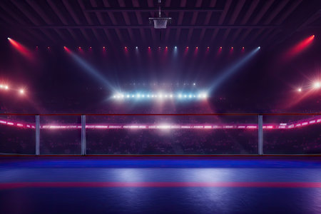 Immaculate professional hockey rink shining in bright white and intense blue spotlights