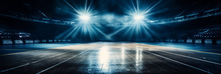 Sports arena with floodlights and empty seats during the night time.