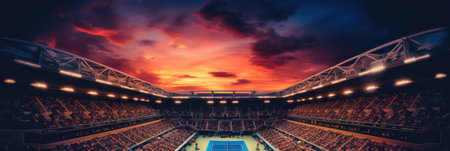 This image showcases an empty indoor sports arena featuring a tennis court, highlighting the unique architectural design and ambient lighting, evoking a sense of competition and tranquility.