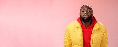 Portrait bored childish cute african bearded 25s male show tongue grimacing making funny faces immature behaviour unwilling grow-up standing pink background mimicking folding lips tube