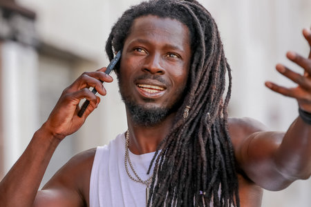 young man with afro hair or dreadlocks talking on mobile phone on the street