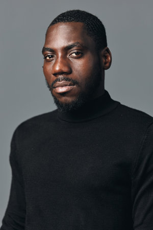 African man portrait with beard wearing black turtleneck sweater in creative conceptual visual style studio. Serious expression, dark skin, closeup with soft lighting on gray background.