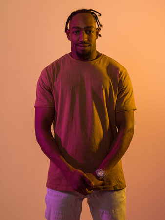 A young African American man showcases his stylish attire while striking a confident pose with neon lighting.